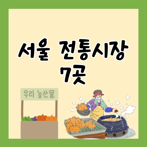서울에는 다양한 전통시장들이 있습니다. 오늘은 그 중에서 가장 유명한 전통시장 7곳을 소개해드리려고 합니다. 다양한 먹거리부터 독특한 소품들까지, 다양한 색깔로 가득 차 있는 전통시장을 둘러보며 옛 서울의 정겨움과 따뜻한 정을 느껴보세요.