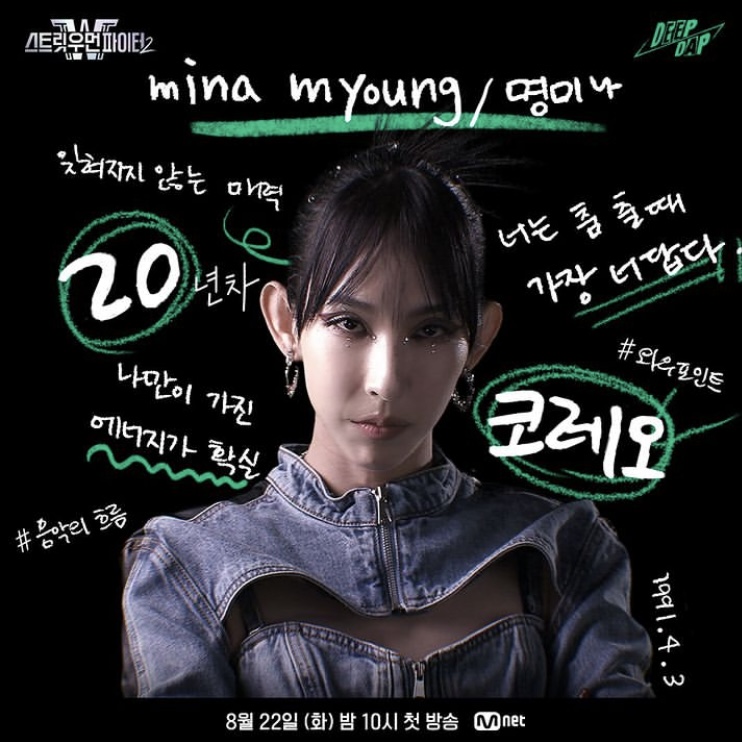 딥앤댑은 이번 <스우파 2> 참가를 위해 만들어진 프로젝트 크루다. 2014년부터 원밀리언 댄스 스튜디오의 안무가와 댄스 트레이너로 원밀리언에서 리아킴, 효진초이와 같이 오래 활동했으나 현재는 탈퇴하고 자신이 만든 뮤트디오라는 댄스 학원을 운영하고 있다. 미나명은 박재범의 <All I wanna do>, 레드벨벳<psycho> 등 많은 k-pop 안무를 창작한 안무가다.