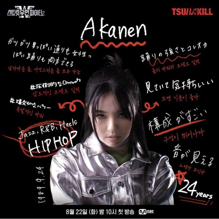 츠바킬은 이번 <스우파2>에 출연하기 위해 만들어진 프로젝트 크루이다. 일본 댄스 신을 평정한 실력파 댄서들이 모였다. 크루의 수장인 아카넨은 보아의 댄스팀, 워너원과 함께 활동하며 K-POP 댄스씬에서도 활약했었다. f(x)루나의 <Free somebody> 안무를 창작한 안무가다. 자넷 잭슨, 아무로 나미에, 기무라 타쿠야 등 일본의 유명 연예인들과 작업한 일본의 탑급 댄서다.