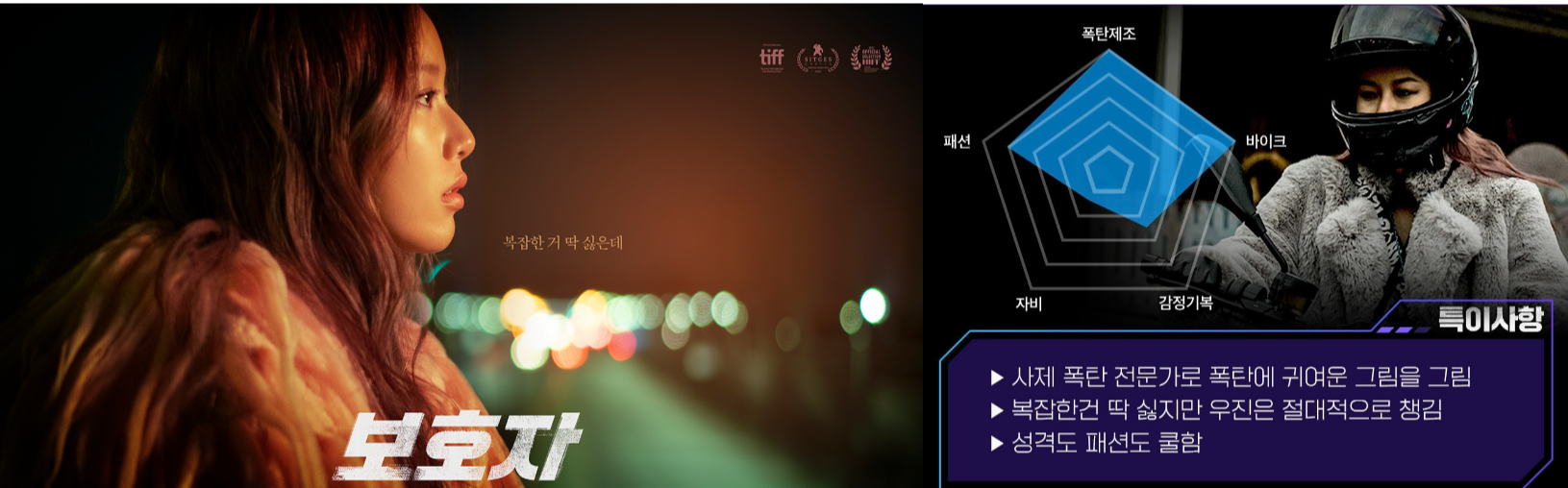 우진의 파트너이자 폭탄 전문 킬러다. 바이크를 몰며, 사제 폭탄을 제조하고 복잡한 건 딱 싫지만 자신보다 오빠 같은 우진을 보호하는 인물이다.