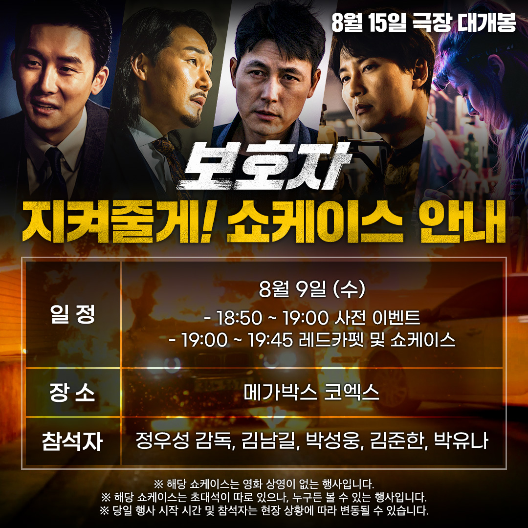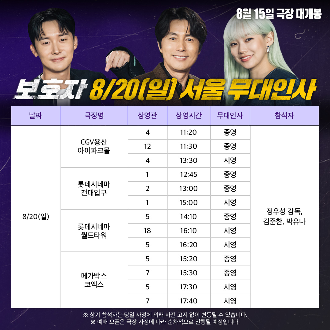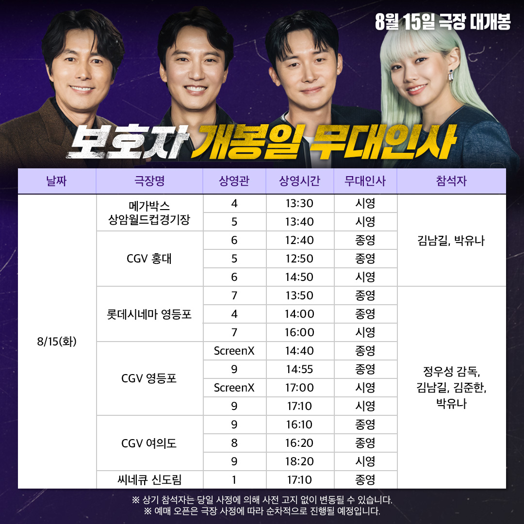 첫 무대인사 일정은 영화 <보호자> 개봉일인 8월 15일에 진행된다. 서울 상암, 홍대, 영등포, 신도림 지역에서 열릴 예정이며