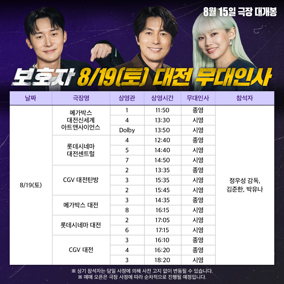대전 지역 무대인사 일정표다. 8/19일에 진행될 예정이며 자세한 극장 정보 및 참석자는 아래에서 확인할 수 있다.